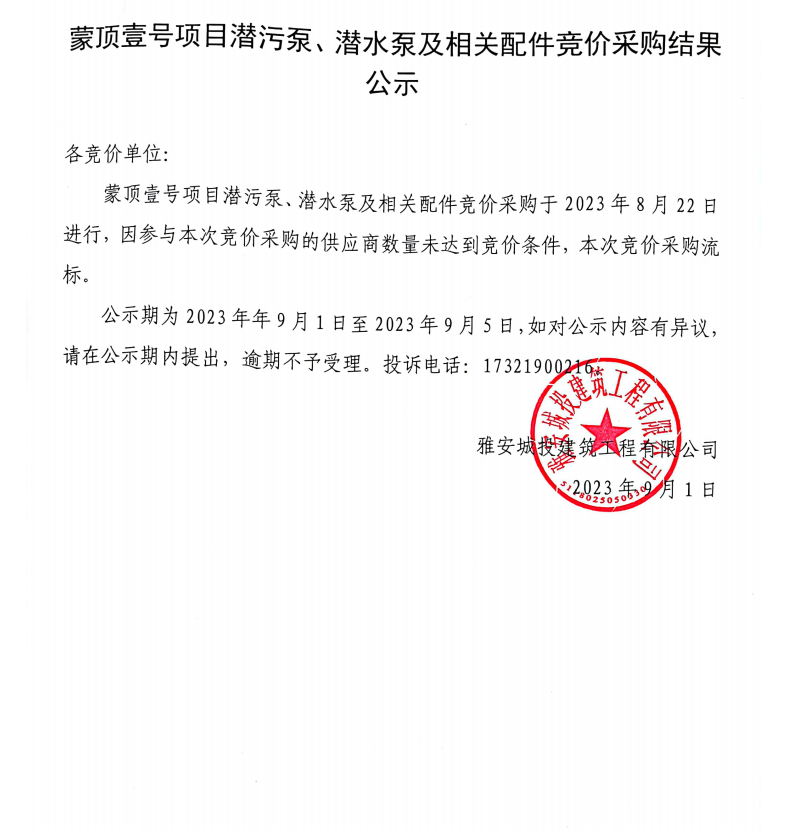 蒙頂壹號(hào)項(xiàng)目潛污泵、潛水泵及相關(guān)配件競(jìng)價(jià)采購(gòu)結(jié)果公示