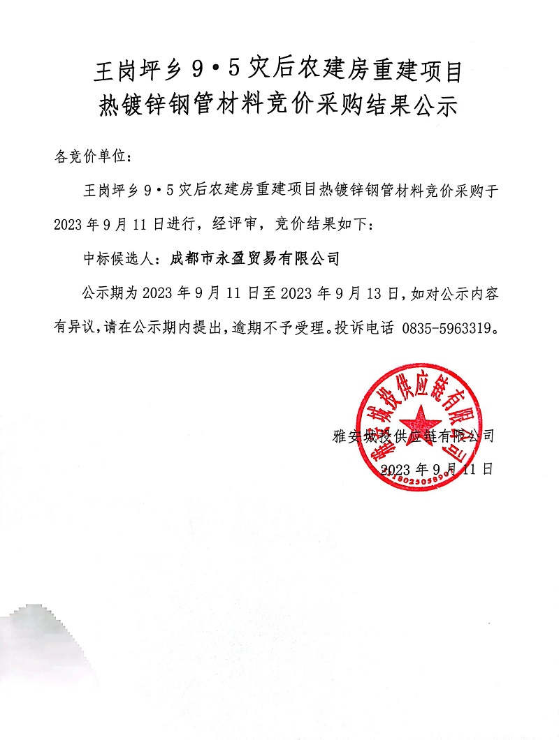 王崗坪鄉(xiāng)9.5災(zāi)后農(nóng)建房重建項(xiàng)目熱鍍鋅鋼管材料競(jìng)價(jià)采購結(jié)果公示