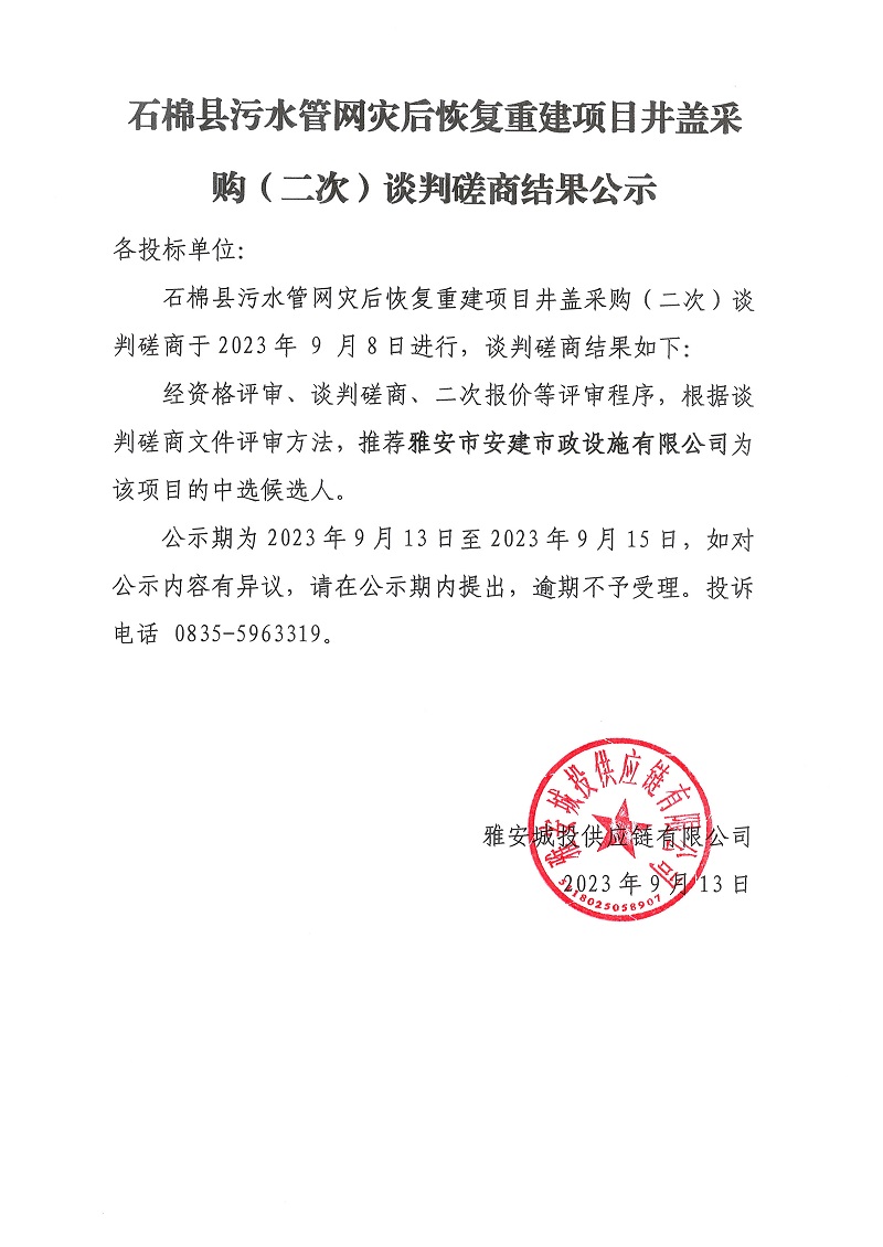 石棉縣污水管網(wǎng)災(zāi)后恢復(fù)重建項目井蓋采購(二次)談判磋商結(jié)果公示