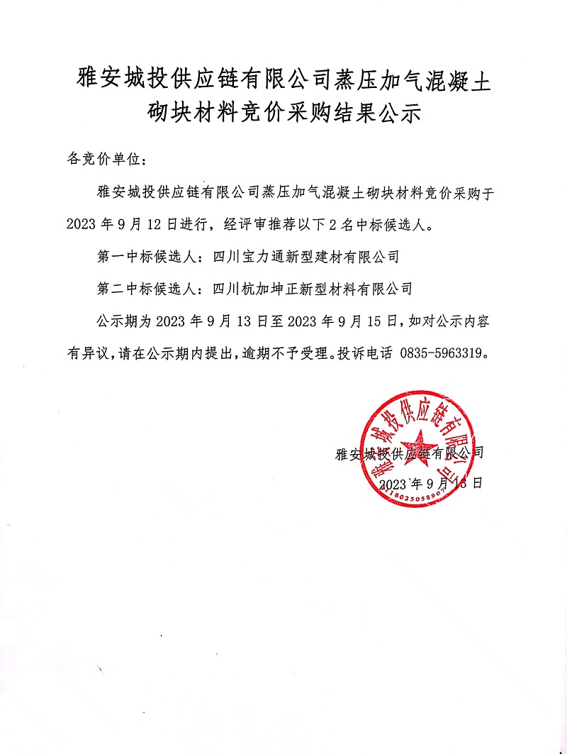 雅安城投供應鏈有限公司蒸壓加氣混凝土砌塊材料競價采購結果公示