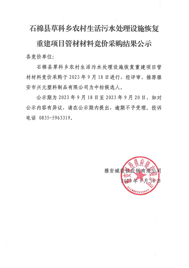 石棉縣草科鄉(xiāng)農(nóng)村生活污水處理設(shè)施恢復重建項目管材材料競價采購結(jié)果公示