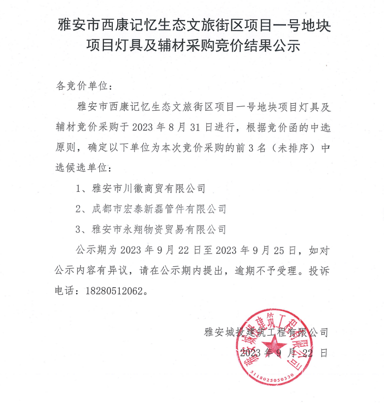 雅安市西康記憶生態(tài)文旅街區(qū)項目一號地塊項目燈具及輔材采購競價結(jié)果公示