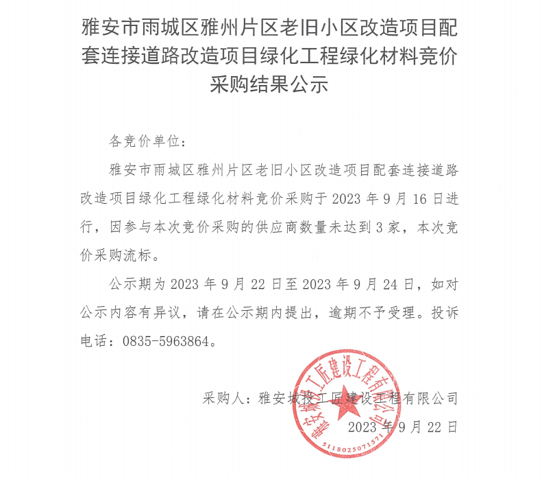 雅安市雨城區(qū)雅州片區(qū)老舊小區(qū)改造項(xiàng)目配套連接道路改造項(xiàng)目綠化工程綠化材料競(jìng)價(jià)采購(gòu)結(jié)果公示