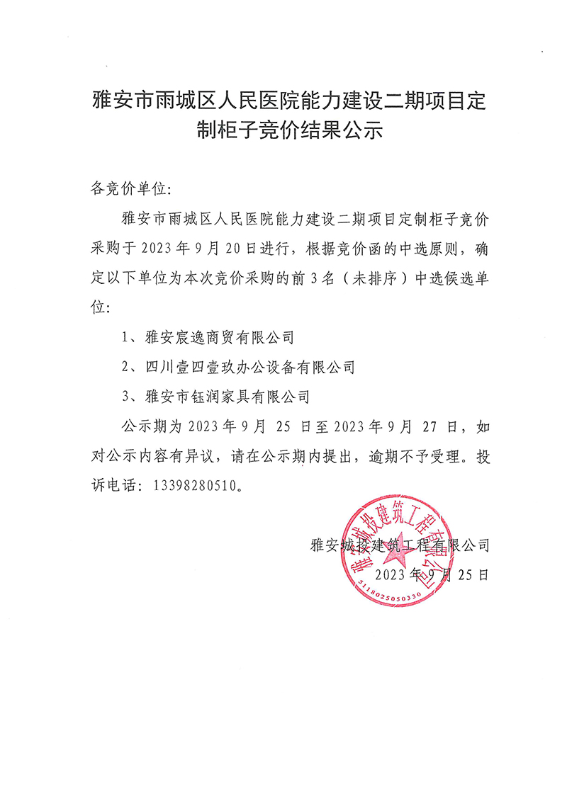 雅安市雨城區(qū)人民醫(yī)院能力建設二期項目定制柜子競價結果公示