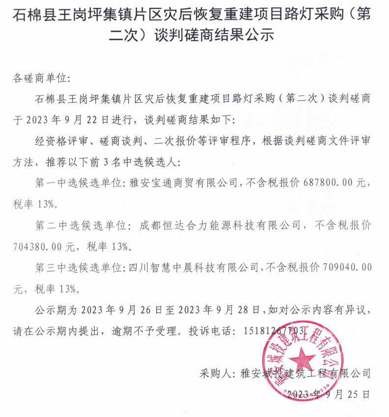 石棉縣王崗坪集鎮(zhèn)片區(qū)災后恢復重建項目路燈采購(第二次)談判磋商結果公示