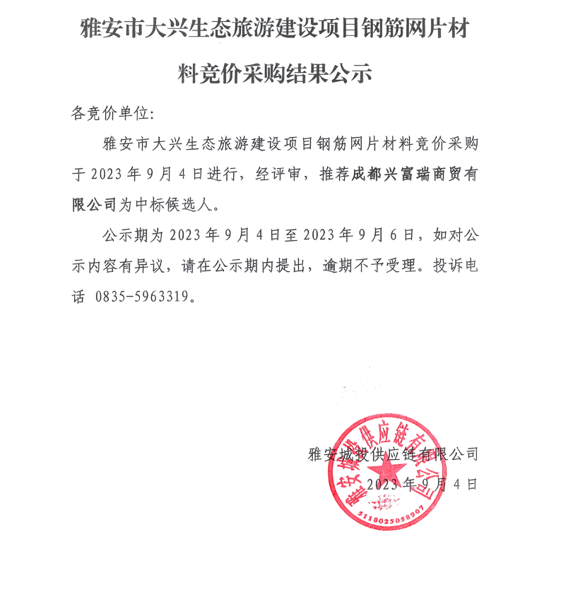 雅安市大興生態(tài)旅游建設(shè)項(xiàng)目鋼筋網(wǎng)片材料競(jìng)價(jià)采購(gòu)結(jié)果公示