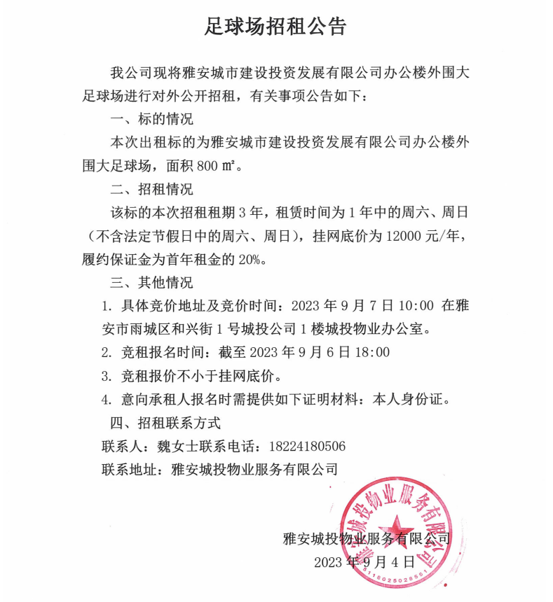 雅安城市建設(shè)投資開(kāi)發(fā)有限公司外圍大足球場(chǎng)招租公告