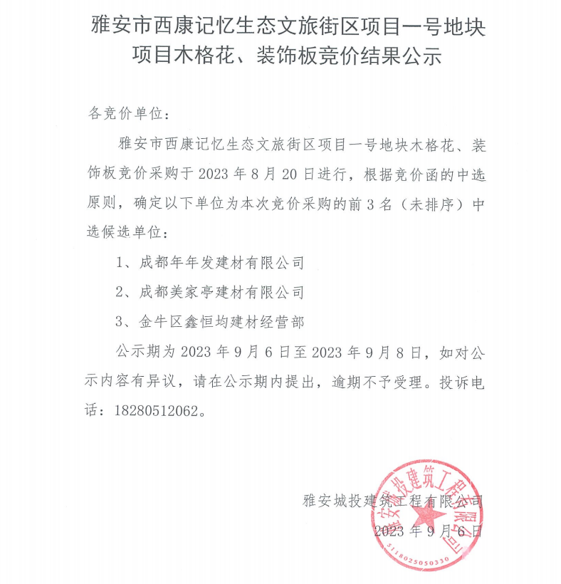 雅安市西康記憶生態(tài)文旅街區(qū)項(xiàng)目一號(hào)地塊項(xiàng)目木格花、裝飾板競(jìng)價(jià)結(jié)果公示