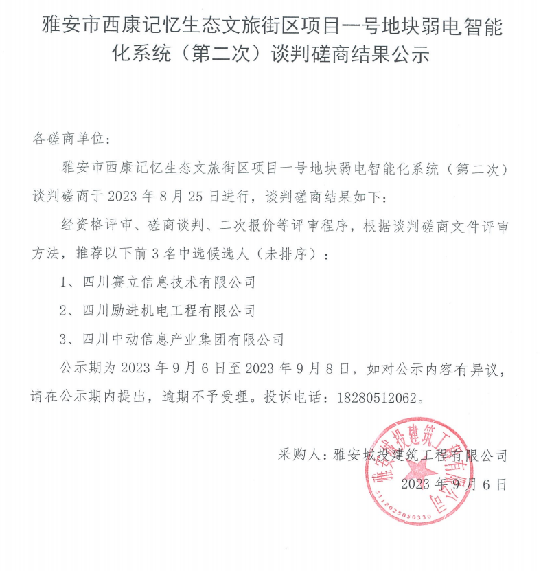 雅安市西康記憶生態(tài)文旅街區(qū)項(xiàng)目一號(hào)地塊弱電智能化系統(tǒng)(第二次) 談判磋商結(jié)果公示