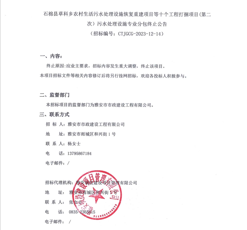 石棉縣草科鄉(xiāng)農(nóng)村生活污水處理設(shè)施恢復(fù)重建項(xiàng)目等十個(gè)工程打捆項(xiàng)目(第二次)污水處理設(shè)施專業(yè)分包終止公告