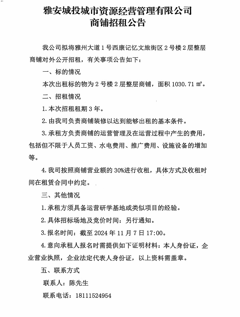 雅安城投城市資源經(jīng)營管理有限公司雅州大道1號(hào)西康記憶文旅街區(qū)2號(hào)樓2層整層商鋪招租公告