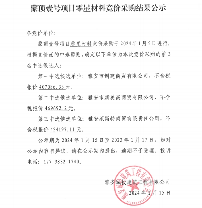 蒙頂壹號項(xiàng)目零星材料競價(jià)采購結(jié)果公示