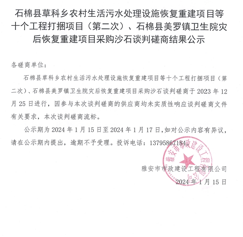石棉縣草科鄉(xiāng)農(nóng)村生活污水處理設(shè)施恢復重建項目等十個工程打捆項目(第二次)、石棉縣美羅鎮(zhèn)衛(wèi)生院災(zāi)后恢復重建項目采購沙石談判磋商結(jié)果公示
