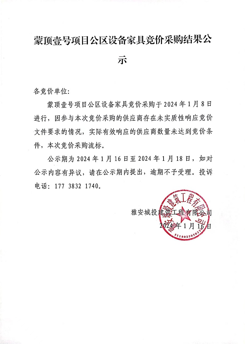 蒙頂壹號(hào)項(xiàng)目公區(qū)設(shè)備家具競(jìng)價(jià)采購(gòu)結(jié)果公示