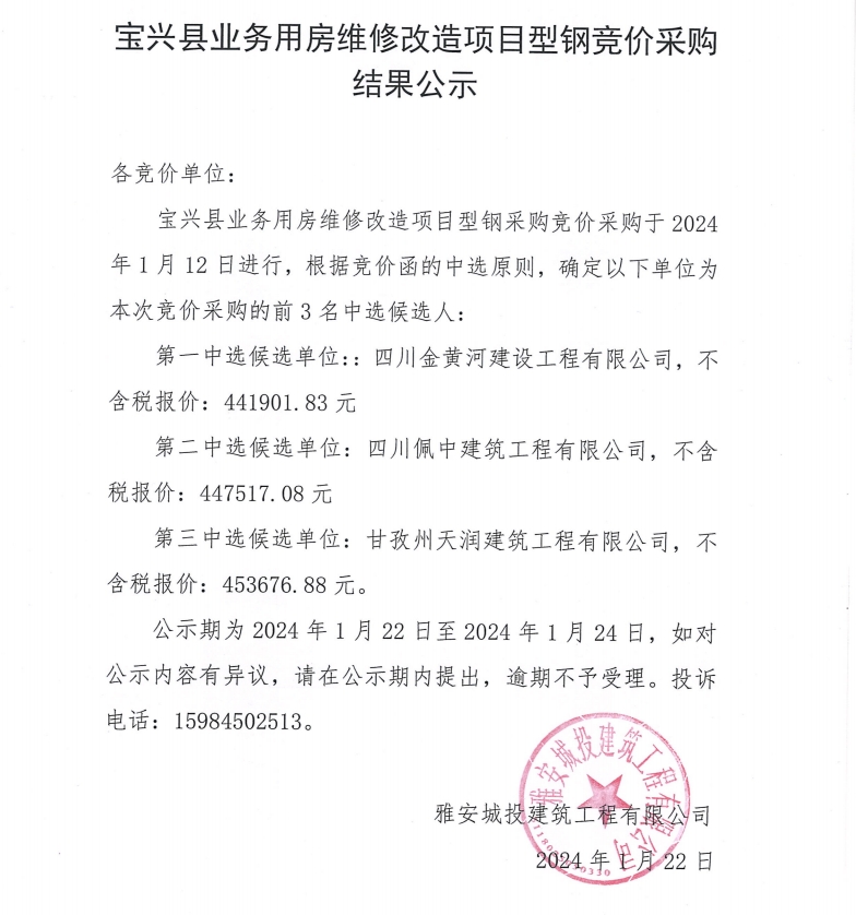 寶興縣業(yè)務(wù)用房維修改造項(xiàng)目型鋼競價(jià)采購結(jié)果公示