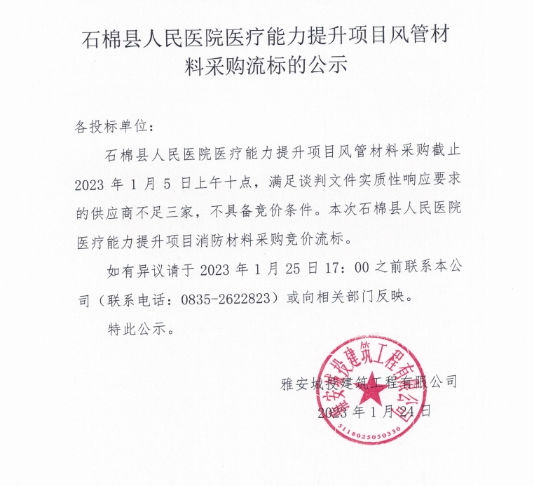 石棉縣人民醫(yī)院醫(yī)療能力提升項(xiàng)目風(fēng)管材料采購(gòu)流標(biāo)的公示