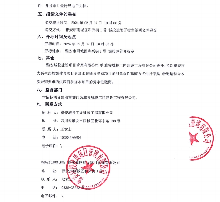 雅安市大興生態(tài)旅游建設(shè)項(xiàng)目景觀水景噴泉采購項(xiàng)目公告
