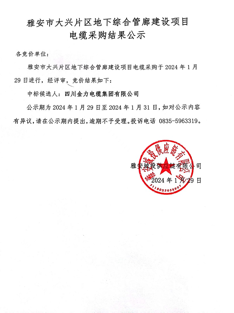 雅安市大興片區(qū)地下綜合管廊建設(shè)項(xiàng)目電纜采購(gòu)結(jié)果公示