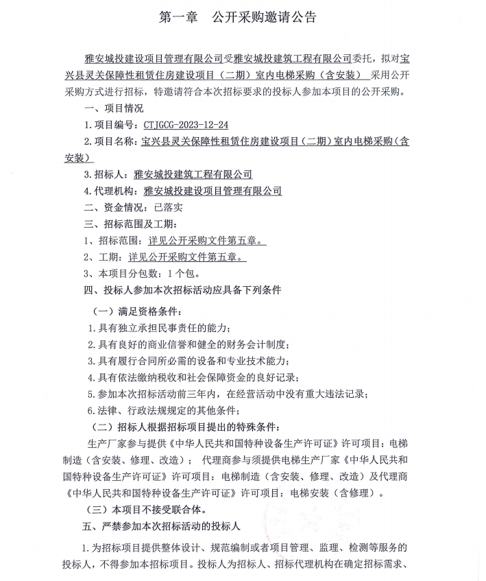 寶興縣靈關(guān)保障性租賃住房建設(shè)項(xiàng)目(二期)室內(nèi)電梯采購(gòu)(含安裝)公開采購(gòu)邀請(qǐng)公告