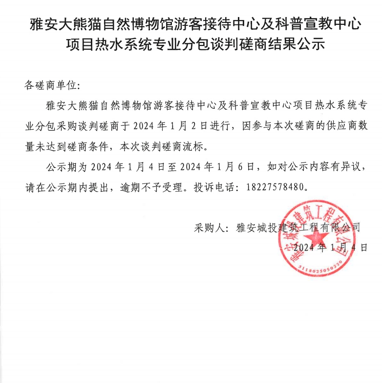 雅安大熊貓自然博物館游客接待中心及科普宣教中心項(xiàng)目熱水系統(tǒng)專業(yè)分包談判磋商結(jié)果公示
