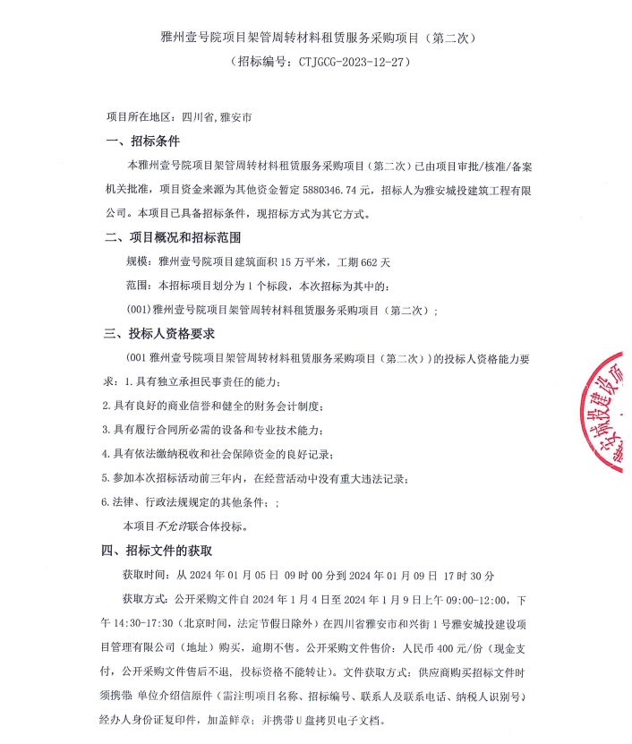 雅州壹號院項目架管周轉材料租賃服務采購項目(第二次)公告
