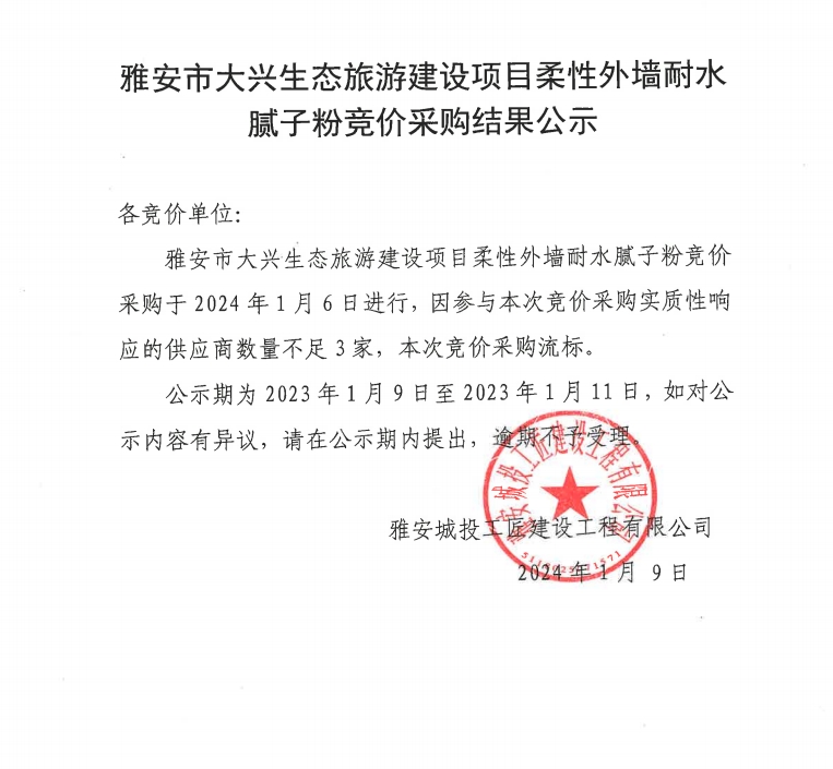 雅安市大興生態(tài)旅游建設(shè)項目柔性外墻耐水膩子粉材料競價采購結(jié)果公示