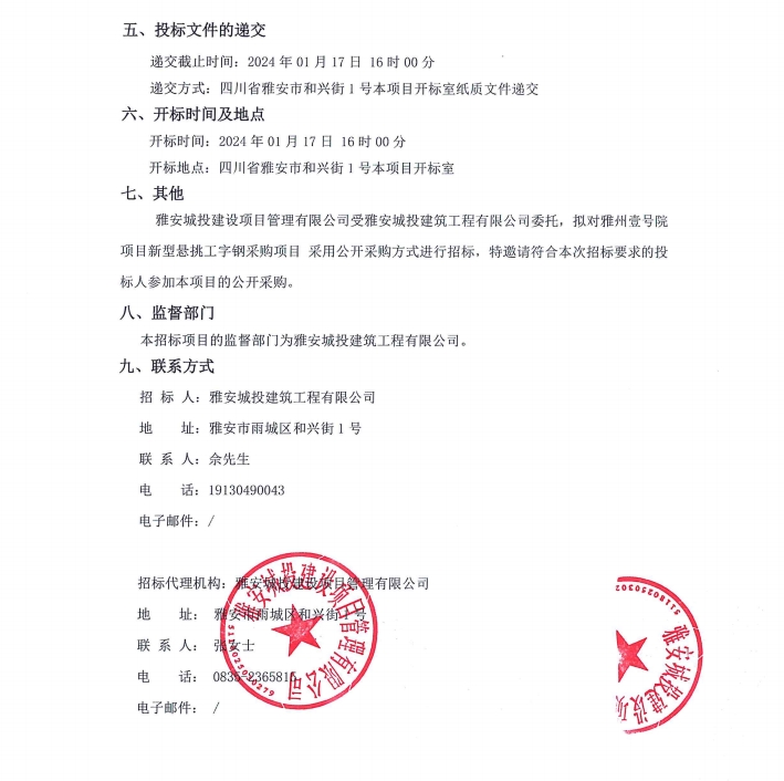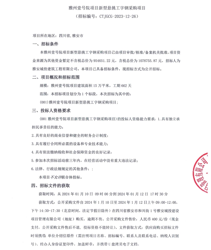 雅州壹號(hào)院項(xiàng)目新型懸挑工字鋼采購(gòu)項(xiàng)目公告