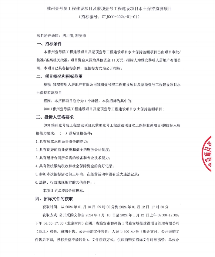 雅州壹號院工程建設(shè)項(xiàng)目及蒙頂壹號工程建設(shè)項(xiàng)目水土保持監(jiān)測項(xiàng)目公告
