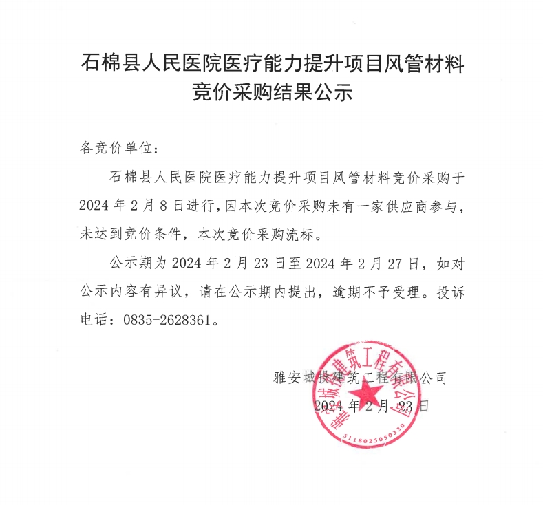 石棉縣人民醫(yī)院醫(yī)療能力提升項目風(fēng)管材料競價采購結(jié)果公示