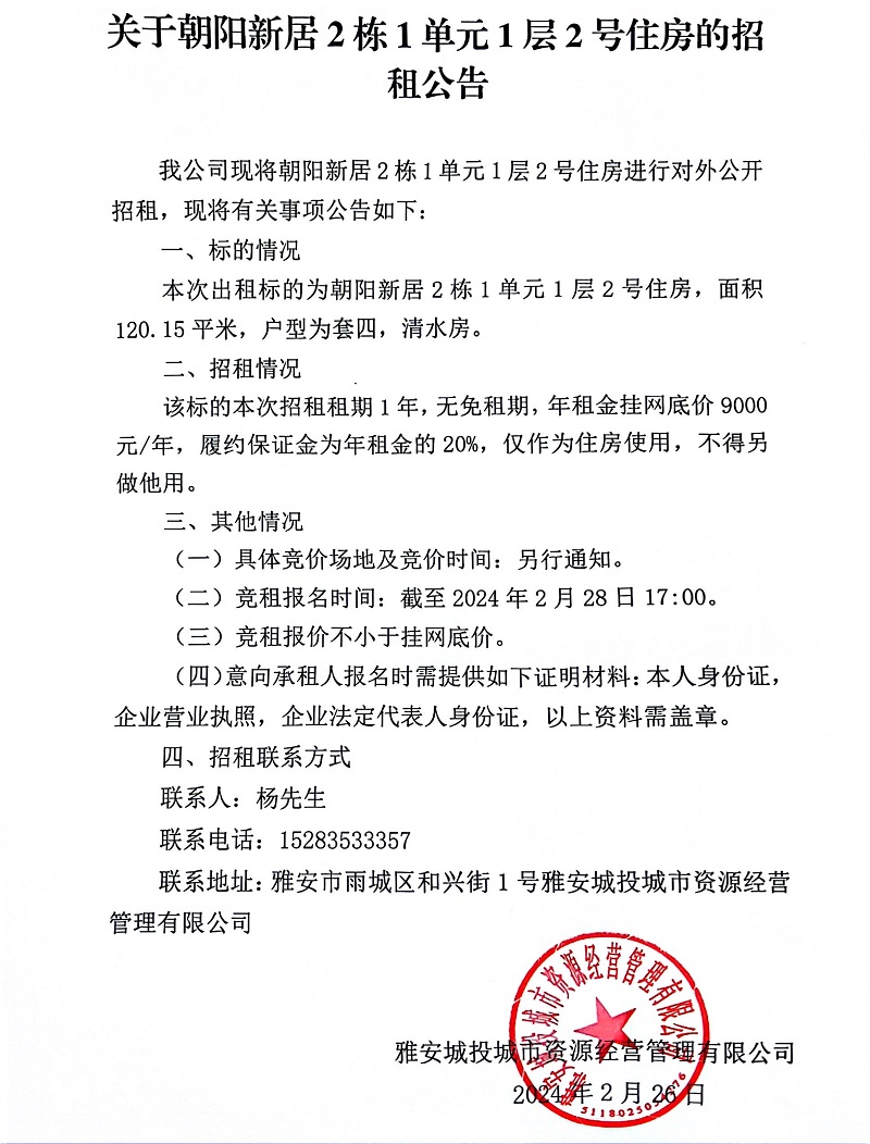 關(guān)于朝陽(yáng)新居2棟1單元1層2號(hào)住房的招租公告