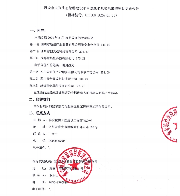 雅安市大興生態(tài)旅游建設(shè)項(xiàng)目景觀水景噴泉采購(gòu)項(xiàng)目更正公告