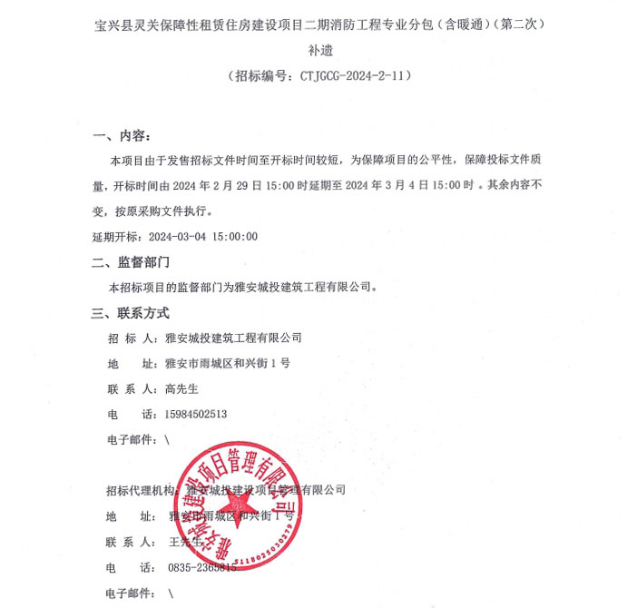 寶興縣靈關(guān)保障性租賃住房建設(shè)項目二期消防工程專業(yè)分包(含暖通)(第二次)補遺公告