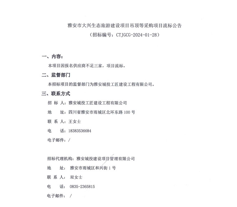 雅安市大興生態(tài)旅游建設(shè)項(xiàng)目吊頂?shù)炔少?gòu)項(xiàng)目流標(biāo)公告