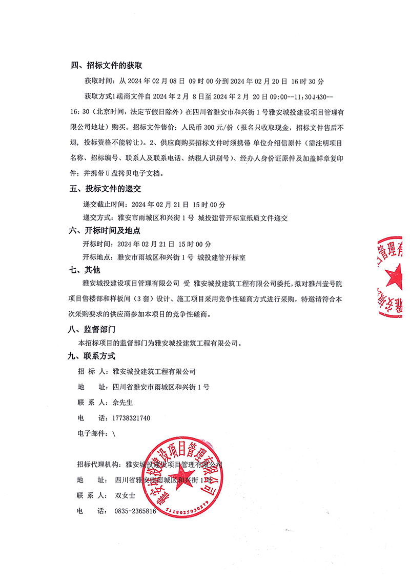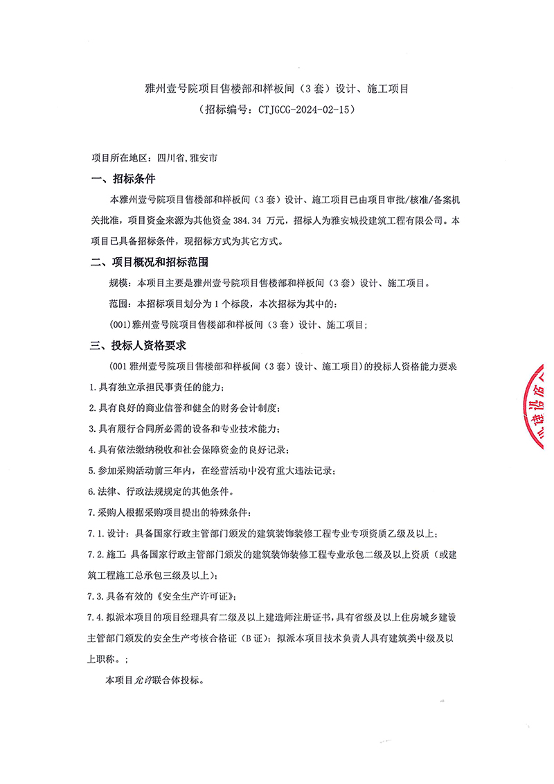 雅州壹號項目售樓部和樣板間(3套)設計、施工項目招標公告