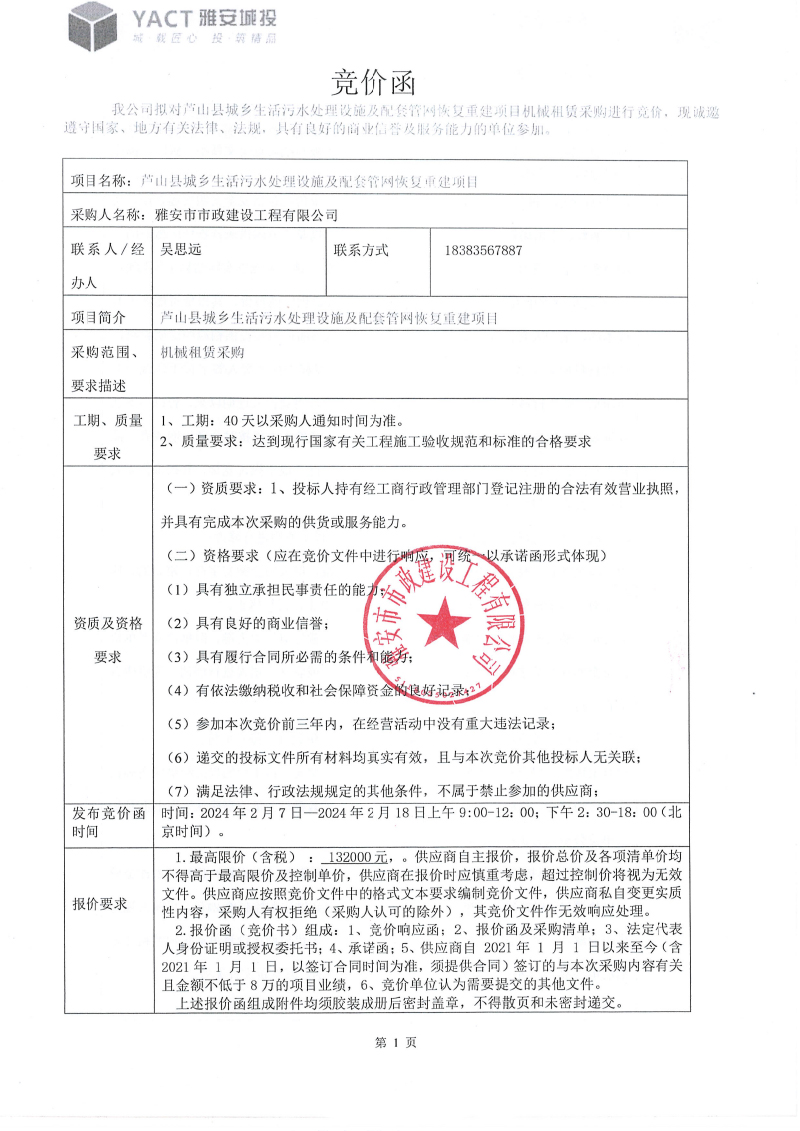 蘆山縣城鄉(xiāng)垃圾處理設(shè)施及配套管網(wǎng)恢復(fù)重建項目機械租賃采購競價函