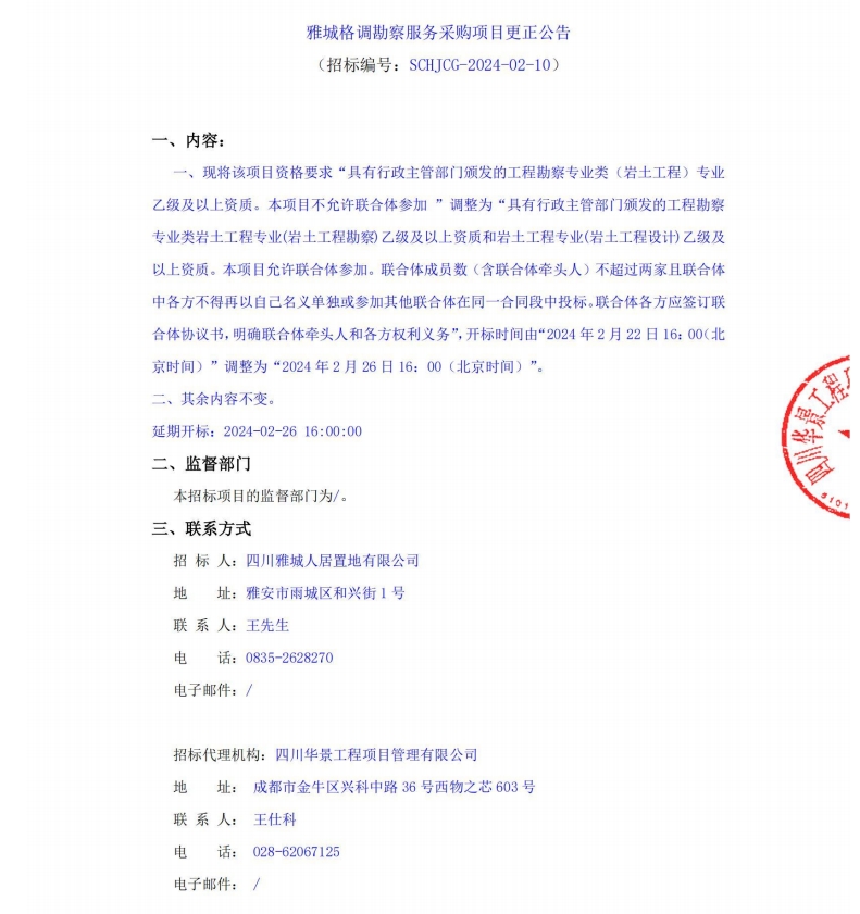 雅城格調(diào)勘察服務(wù)采購(gòu)項(xiàng)目更正公告