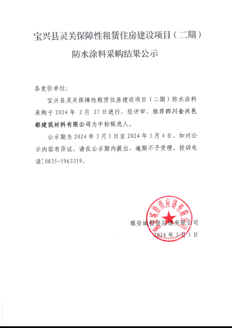 寶興縣靈關(guān)保障性租賃住房建設(shè)項(xiàng)目(二期)防水涂料采購結(jié)果公示
