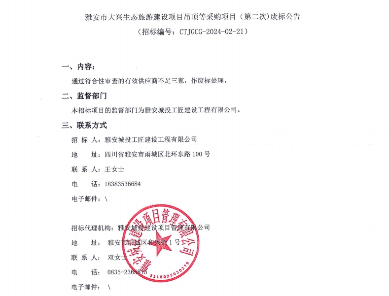 雅安市大興生態(tài)旅游建設項目吊頂?shù)炔少忢椖浚ǖ诙危⿵U標公告