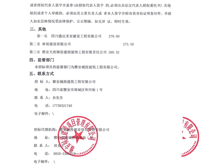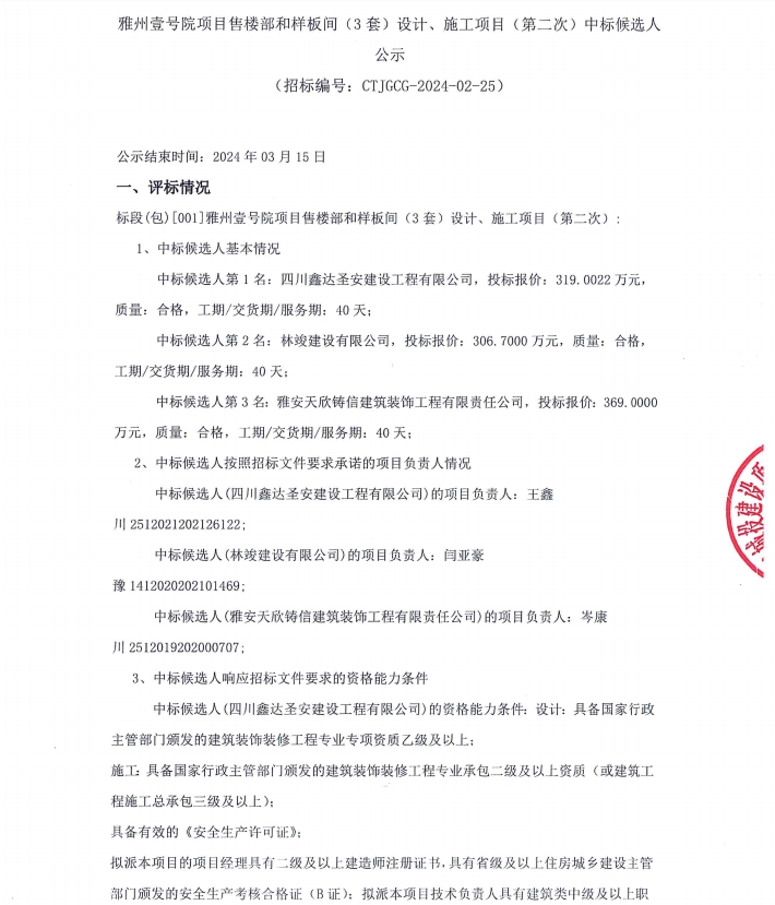 雅州壹號院項目售樓部和樣板間(3套)設(shè)計、施工項目(第二次)中標(biāo)候選人公示