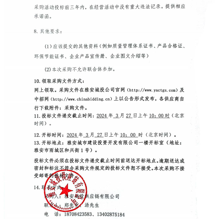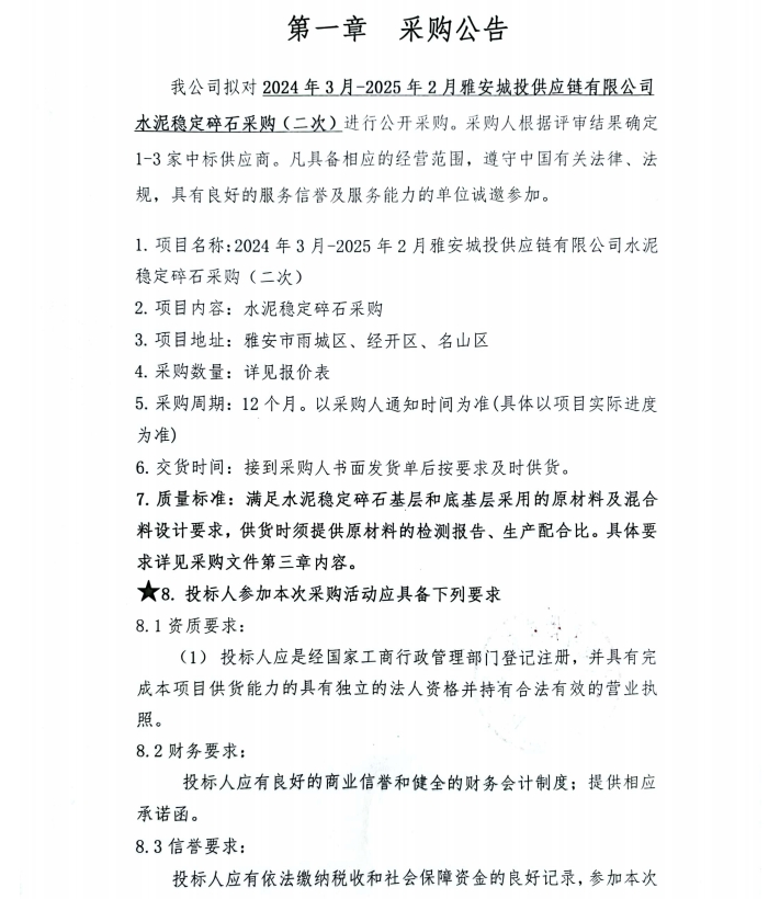 2024年3月-2025年2月雅安城投供應鏈有限公司水泥穩(wěn)定碎石采購(二次)公告