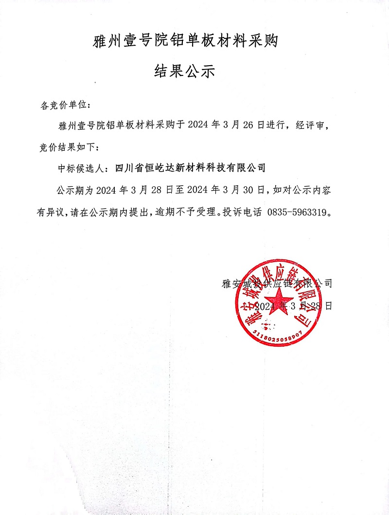 雅州壹號(hào)院鋁單板材料采購(gòu)結(jié)果公示