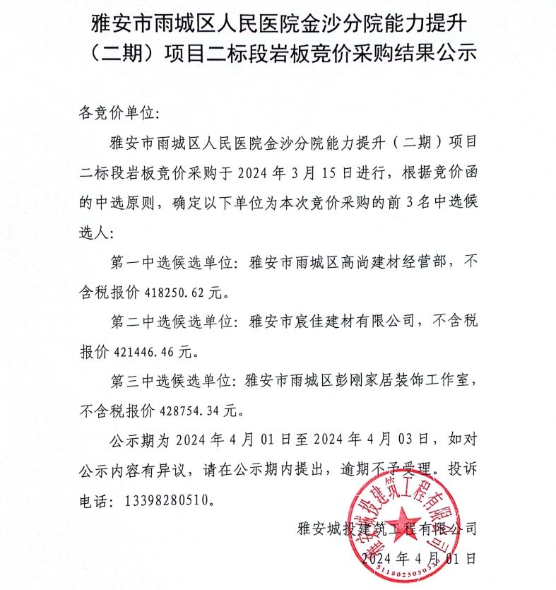 雅安市雨城區(qū)人民醫(yī)院金沙分院能力提升(二期)項目二標(biāo)段巖板競價采購結(jié)果公示