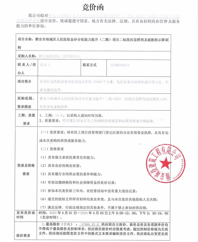 雅安市雨城區(qū)人民醫(yī)院金沙分院能力提升(二期)項(xiàng)目二標(biāo)段應(yīng)急照明及疏散指示牌采購(gòu)競(jìng)價(jià)公告