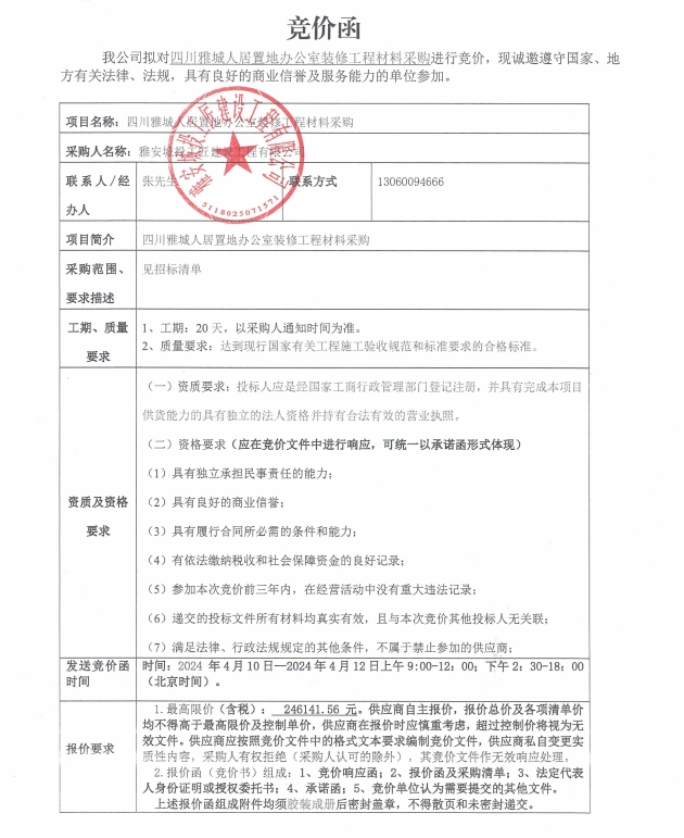 四川雅城人居置地辦公室裝修工程材料采購(gòu)競(jìng)價(jià)公告