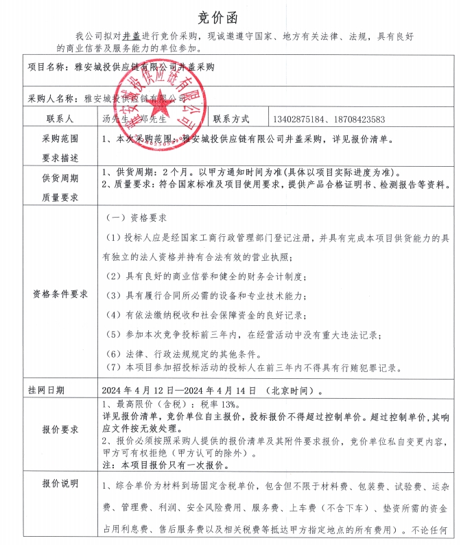 雅安城投供應(yīng)鏈有限公司井蓋采購(gòu)競(jìng)價(jià)公告