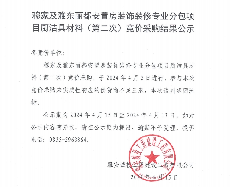 穆家及雅東麗都安置房裝飾裝修專業(yè)分包項目廚具材料(第二次)競價采購結(jié)果公示