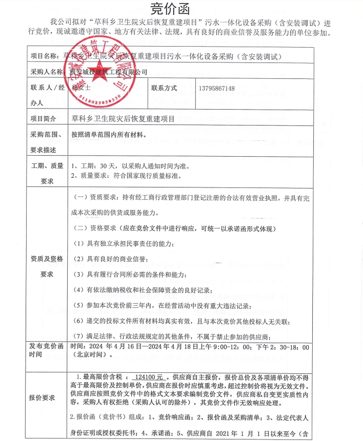 草科鄉(xiāng)衛(wèi)生院災后恢復重建項目污水一體化設備采購(含安裝調試)競價公告