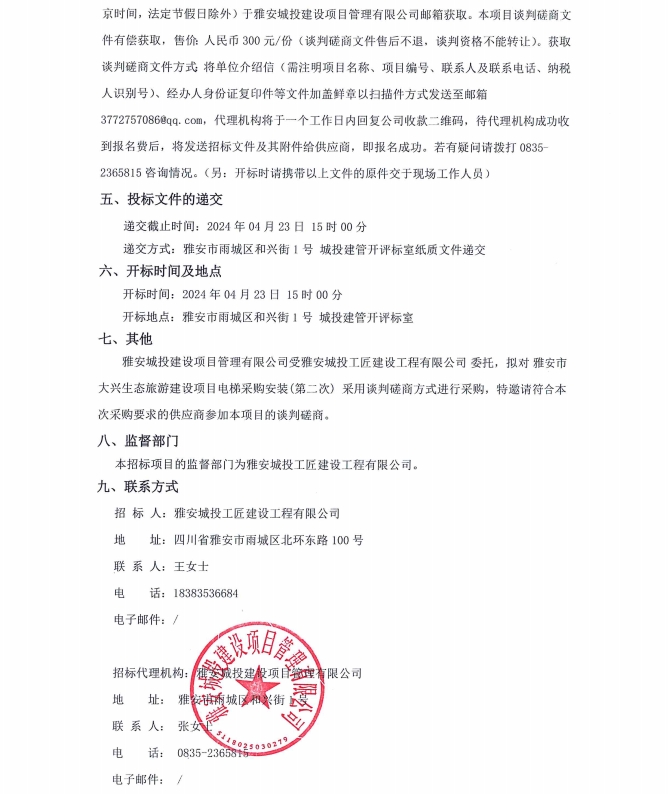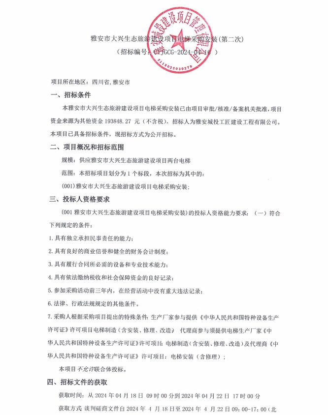 雅安市大興生態(tài)旅游建設(shè)項(xiàng)目電梯采購安裝(第二次)公告