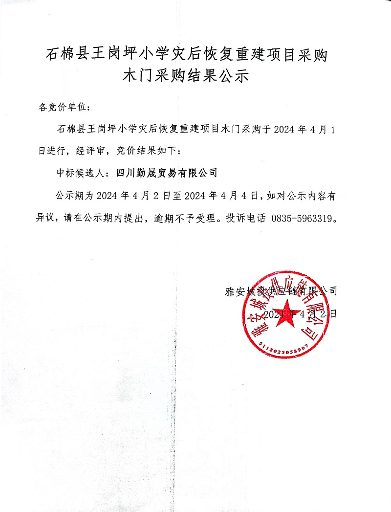 石棉縣王崗坪小學(xué)災(zāi)后恢復(fù)重建項(xiàng)目采購(gòu)木門(mén)采購(gòu)結(jié)果公示