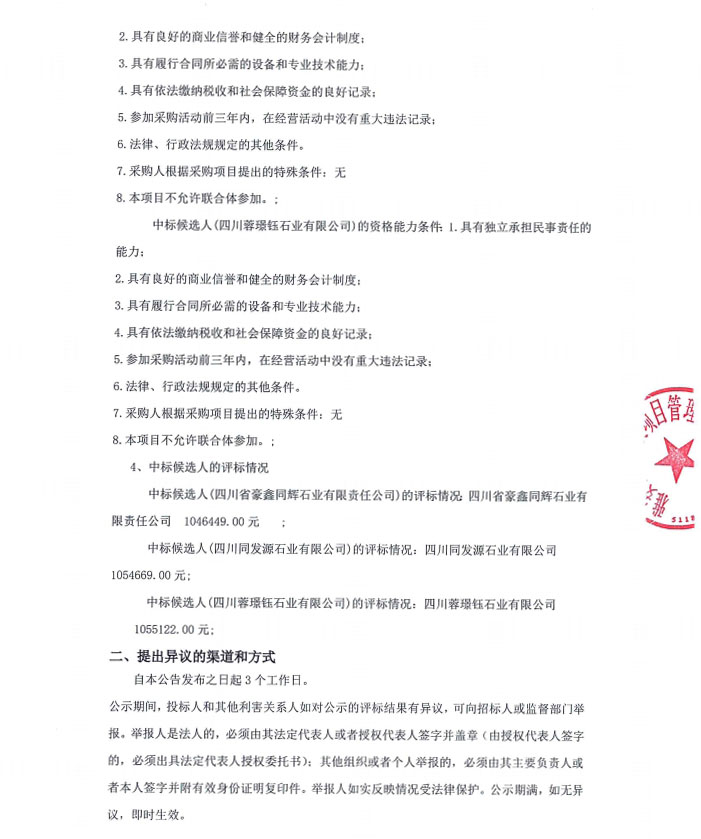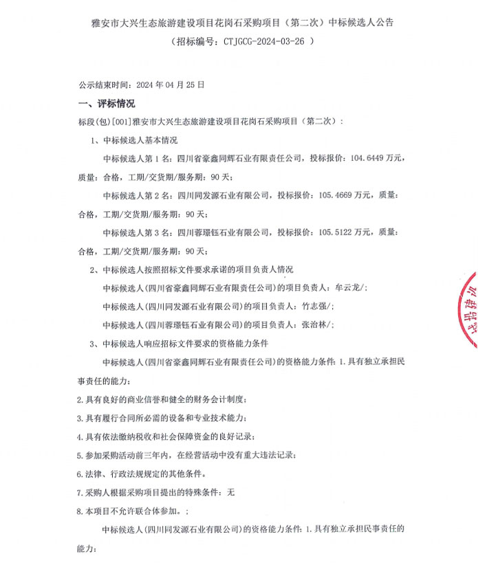 雅安市大興生態(tài)旅游建設(shè)項(xiàng)目花崗石采購項(xiàng)目(第二次)中標(biāo)候選人公告